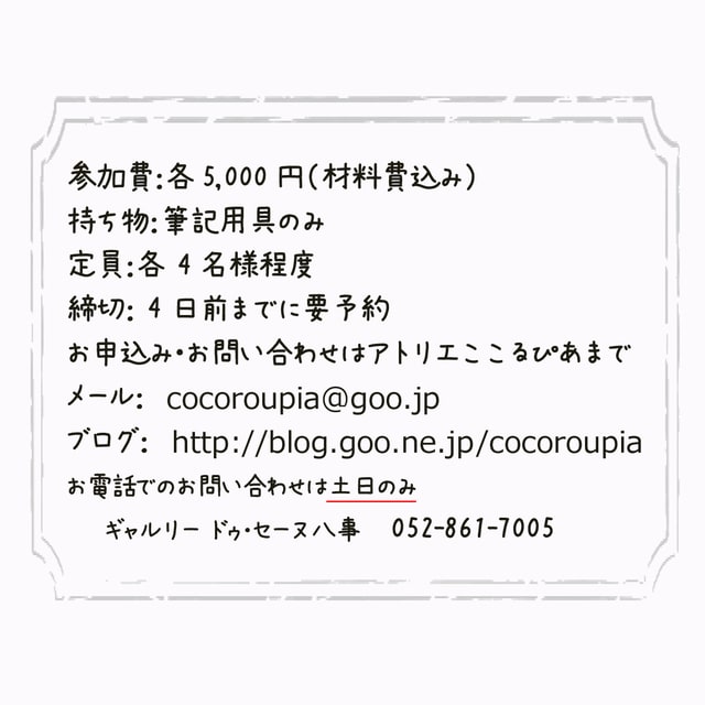 あるいは上記のメール、アトリエここるぴあ宛にお願いします。