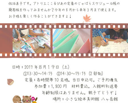 八ヶ岳の小さな絵本美術館で開催予定のワークショップ。「じゃばらスケジュール帳を作ってみましょう!」についてのご案内です小さな絵本美術館のfacebookでも紹介していただいています。アトリエここるぴあの定番スケジュール帳を簡単に、シンプルだ...