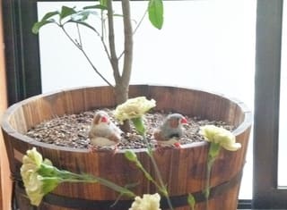 そんな2羽が、こるが眠っているキンモクセイの植え木を