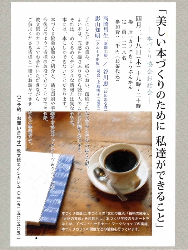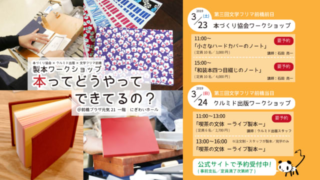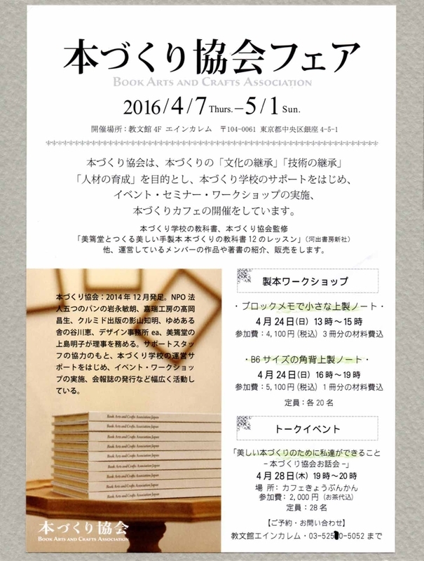本づくり協会フェア 本づくりのための横浜物語 2016.04.072026.02.08 先日、修了展をおこない、私が2年間製本の勉強をさせていただいた 本づくり学校の運営サポートなどをしている本づくり協会のイベントを ご紹介します。 「本づくり協会フェア」詳細はこちらで↓ 受講生や、私たち修了生の作品の展示はありませんが、ワークショップや トークイベントなど開催されます。ご興味のある方、ぜひどうぞ!