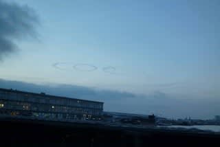 ぐるぐるした飛行機雲。空軍の訓練の跡?
