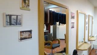 カウンターの後ろには、写真を並べた帆布2枚と、その間にはカモミールと
