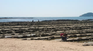 青島神社へは鬼の洗濯板と呼ばれる波打ち際を見ながら海上の参道(橋)を歩き